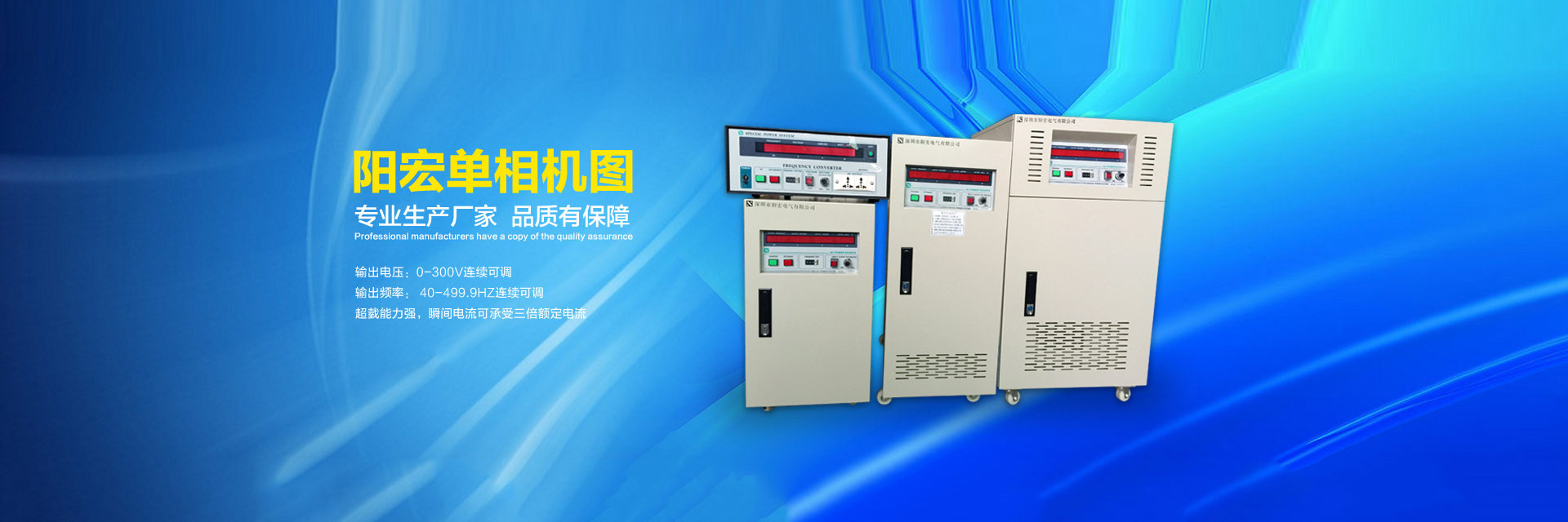 20年變頻電源制造品質(zhì)-陽宏變頻電源為您提供5KVA變頻電源,10KVA變頻電源,20KVA變頻電源,30KVA變頻電源,45KVA變頻電源,60KVA變頻電源,75KVA變頻電源,深圳單相/三相/交流變頻電源等。 模擬式變頻電源,晶體管式變頻電源,可編程式變頻電源,單相大功率變頻電源,三相大功率變頻電源是陽宏電源股份有限公司的核心產(chǎn)品。深圳市陽宏電氣有限公司隸屬臺灣陽宏電源股份有限公司,是一家變頻電源開發(fā)、研制、生產(chǎn)、銷售和服務(wù)的高新技術(shù)企業(yè)。其大陸工廠:深圳市陽宏電氣有限公司,是臺灣陽宏電源股份有限公司在中國大陸一家分公司,地址:深圳市寶安區(qū)觀瀾街道觀瀾高新科技園區(qū)。 臺灣陽宏電源股份有限公司創(chuàng)建于1995年,目前除了臺北公司以外,在中國的廣東深圳設(shè)有分公司,工廠擁有許多的先進(jìn)設(shè)備。具有年產(chǎn)各種電子儀器電源設(shè)備20000臺以上,工廠有嚴(yán)格的生產(chǎn)能力,強(qiáng)大的開發(fā)技術(shù)的管理制度,可以接受新高技術(shù)產(chǎn)品的開發(fā)與研制。